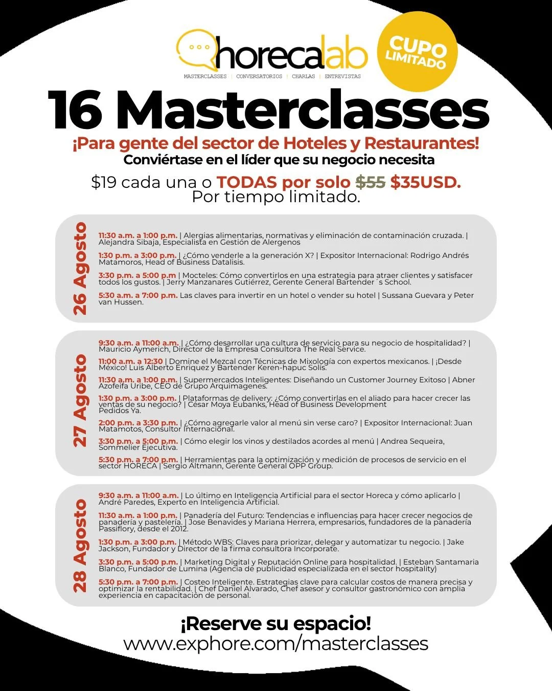 Incluye acceso exclusivo a todas más de 10 masterclasses impartidas por expertos nacionales e internacionales durante los días 26, 27 y 28 de agosto, 2025 en el Horeca Lab de EXPHORE.