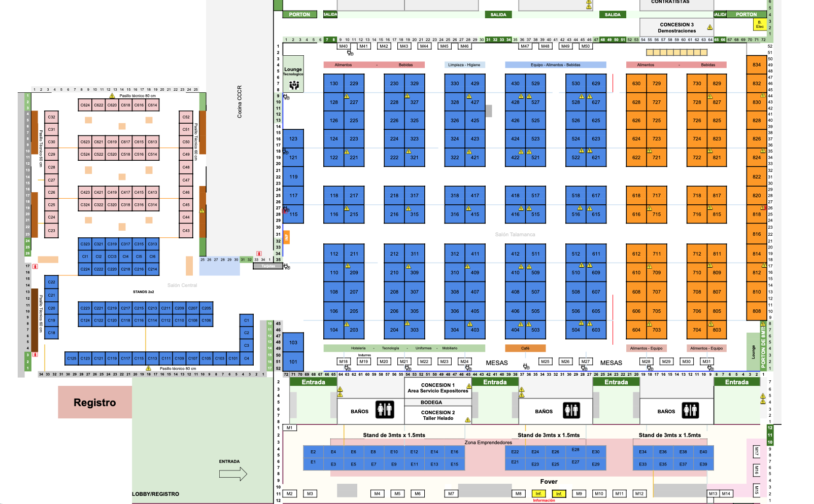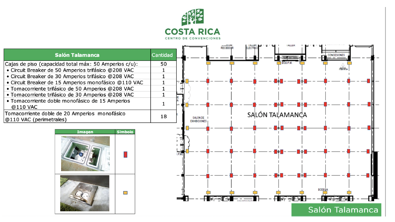 El Centro de convenciones cuenta con cajas en el piso cada 9 metros, estas cajas deberán ser compartidas por diferentes expositores en algunos casos.